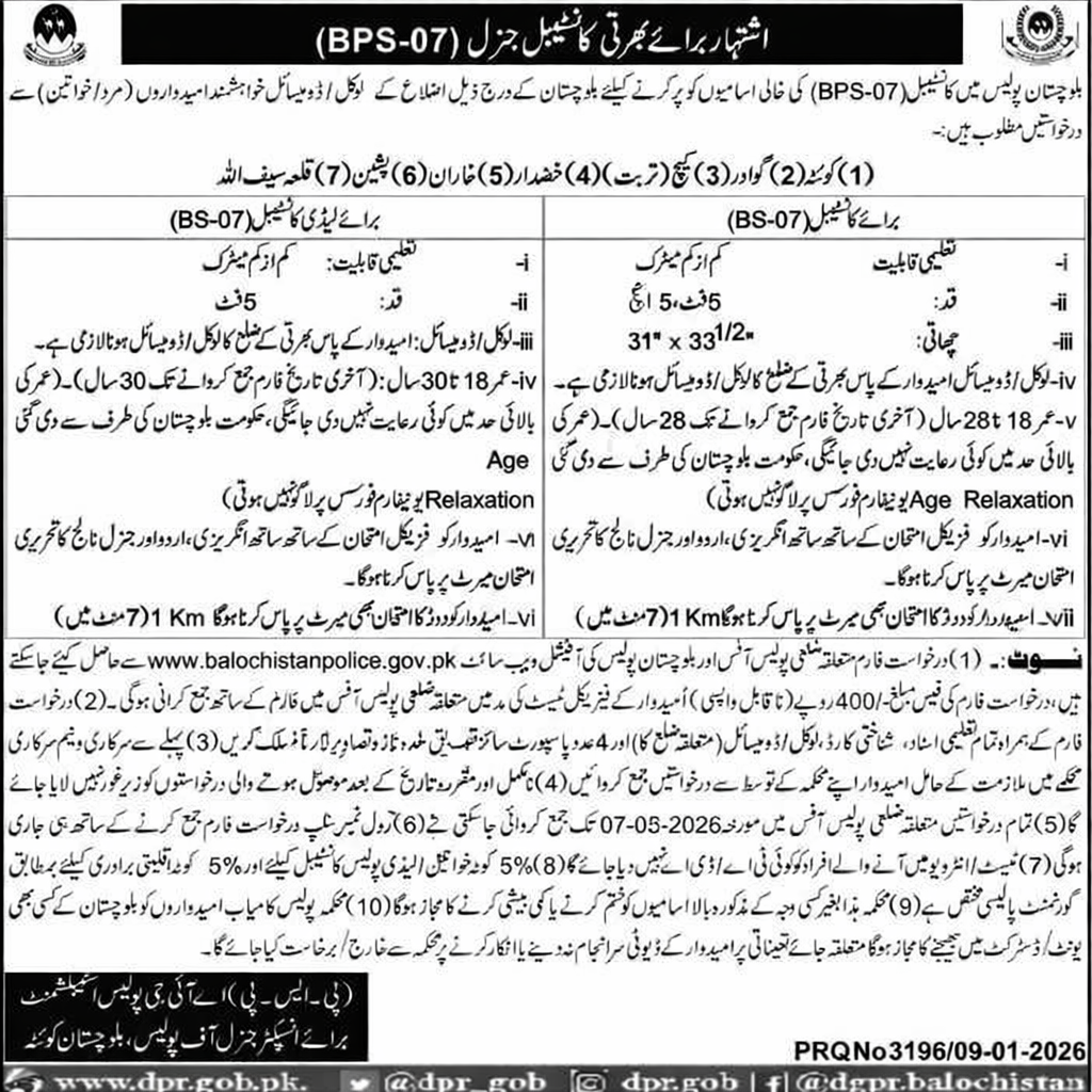 This recruitment process is relevant for individuals seeking a government position within the provincial law enforcement structure of Balochistan. Applications must be submitted through the officially prescribed method within the given deadline.