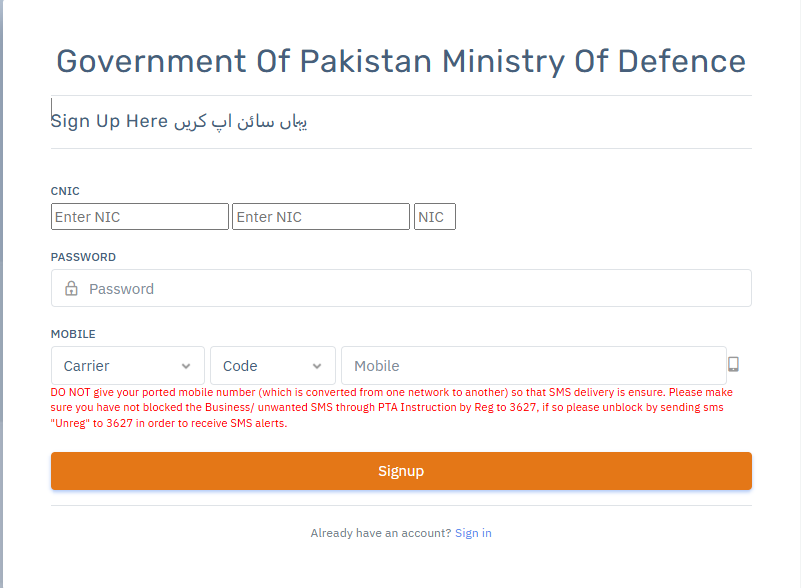 On the Sign Up page, you will see fields for CNIC, Password, and Mobile Number.